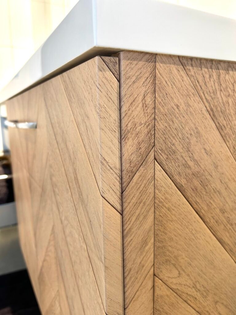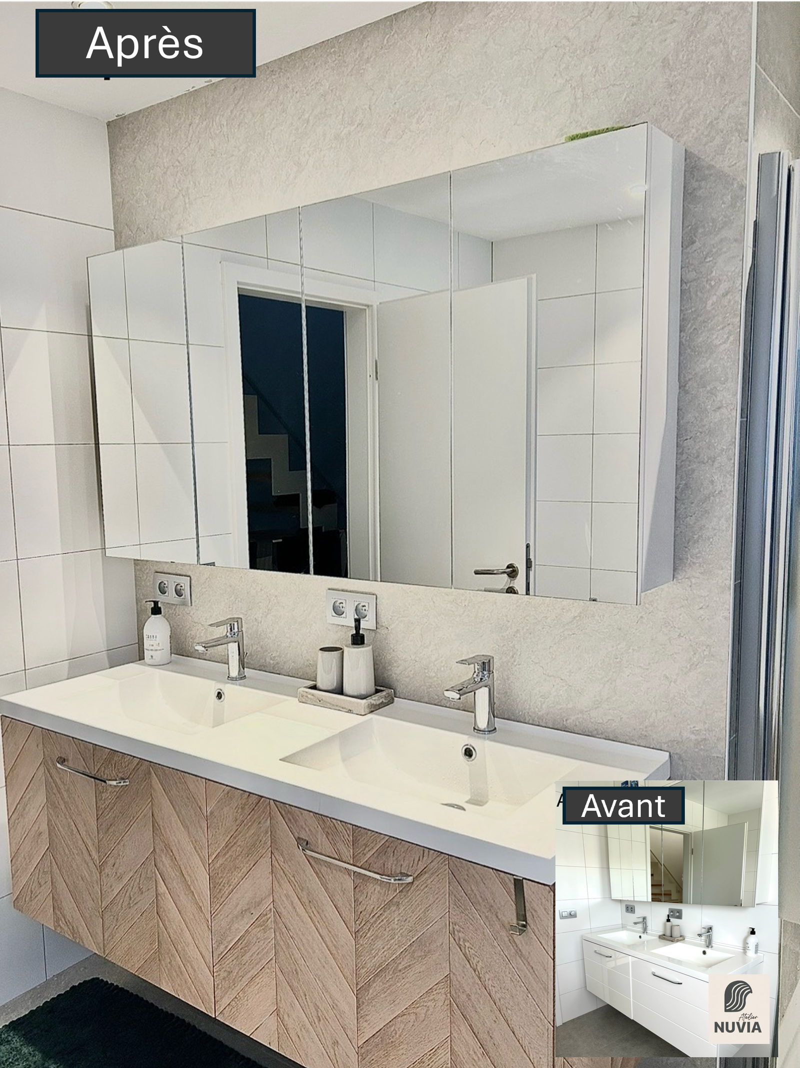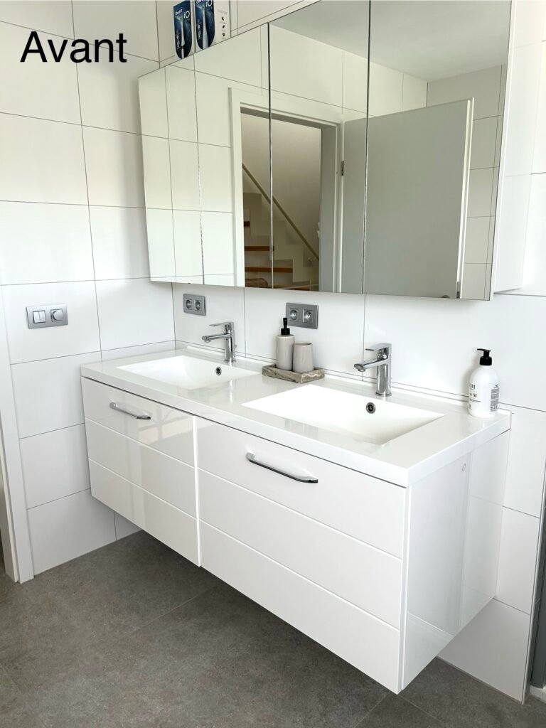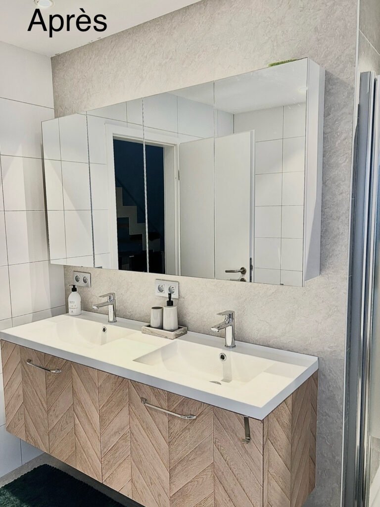 Pose d’un cover marbre beige sur le mur de cette salle de bain : le rendu est tout simplement bluffant. Le meuble, habillé d’un cover effet parquet, apporte une touche chaleureuse et élégante. L’ensemble crée une ambiance raffinée et résolument luxueuse.